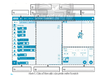 Điền cụm từ thích hợp vào chỗ chấm để chú thích cho cửa sổ làm việc của phần mềm Scratch ở Hình 1.