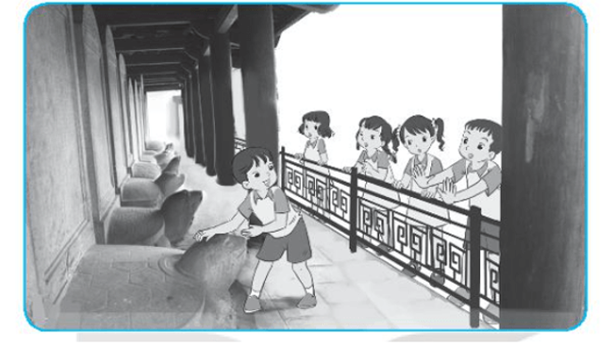 - Cậu không nên vào hẳn bên trong sờ đầu rùa như vậy. Dễ làm hư hỏng tượng rùa lắm. Chúng mình phải biết giữ gìn di tích chứ.