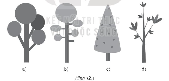 – Cây ở Hình 12.1c có phần lá vẽ bằng hình tam giác, các đoạn chấm trên cây cũng được vẽ bằng hình tam giác với kích thước nhỏ hơn và tô màu đậm hơn.