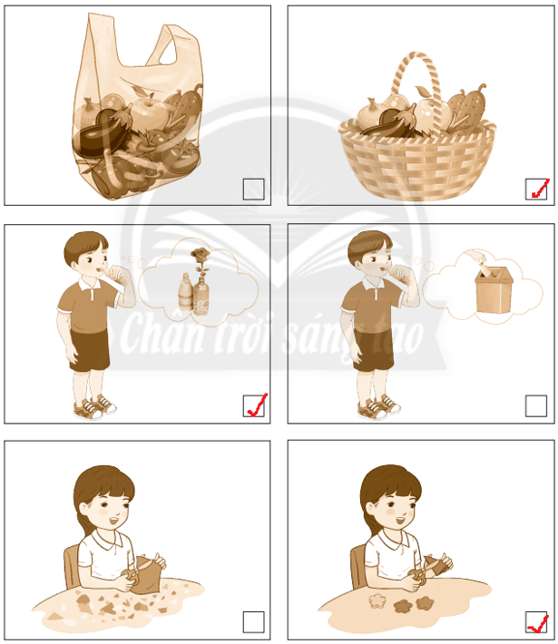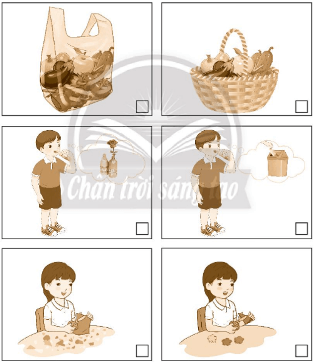 Đánh dấu ✔ vào ô trống ở hình thể hiện việc làm tiêu dùng tiết kiệm và bảo vệ môi trường.