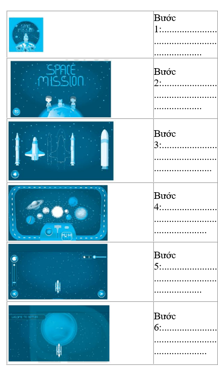 Hãy điền cụm từ gợi ý dưới đây vào chỗ chấm trong các bước để khám phá trò chơi tìm hiểu Hệ Mặt Trời:
