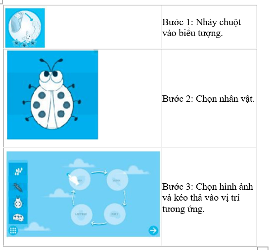 Hãy điền cụm từ gợi ý dưới đây vào chỗ chấm trong các bước để khám phá trò chơi tìm hiểu vòng đời của động vật: