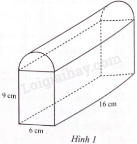 Một khối thuỷ tinh được tạo thành từ một phần dạng hình hộp chữ nhật có kích thước 6 cm, 16 cm, 9 cm và một phần dạng nửa hình trụ có đường kính đáy 6 cm, chiều cao 16 cm (Hình 1). Tính: