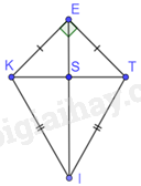 Cho tứ giác EKIT có \(EK = ET,IK = IT,\widehat {KET} = {90^0},\widehat {EKI} = {105^0}\). Gọi S là giao điểm của hai đường chéo. Tính số đo các góc \(\widehat {KIS},\widehat {SKI}\)