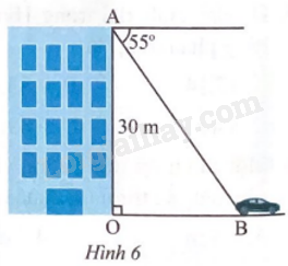 Từ điểm A trên đỉnh một toà nhà cao 30 m, một người nhìn thấy một ô tô đang dừng tại vị trí B dưới một góc nghiêng xuống là 55o (Hình 6).