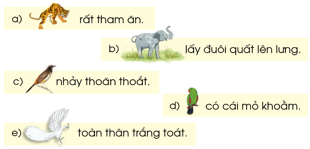 Lũ chích chòe cứ nhảy thoăn thoắt. Con vẹt có cái mỏ khoằm. Còn con công trắng, toàn thân trắng toát".