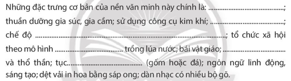 Câu 1. Chọn các từ hoặc cụm từ dưới đây, điền vào chỗ trống (…) cho phù hợp để hoàn thành đoạn thông tin về những đặc trưng cơ bản của văn minh Đông Nam Á.