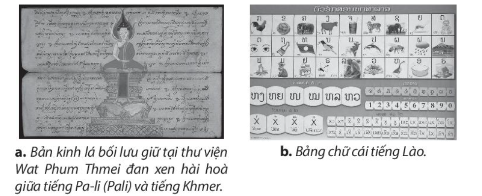 + Chữ viết (chữ Lào); ngôn ngữ (tiếng Khmer).