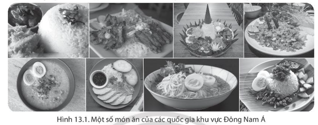 Câu 3. Hãy cho biết các món ăn truyền thống của cư dân Đông Nam Á trong hình được làm từ nguyên liệu chính gì và đã thể hiện tính thống nhất trong đa dạng như thế nào. Từ nguyên liệu chính đó, nêu đặc trưng quan trọng nhất chi phối văn minh Đông Nam Á cổ - trung đại.
