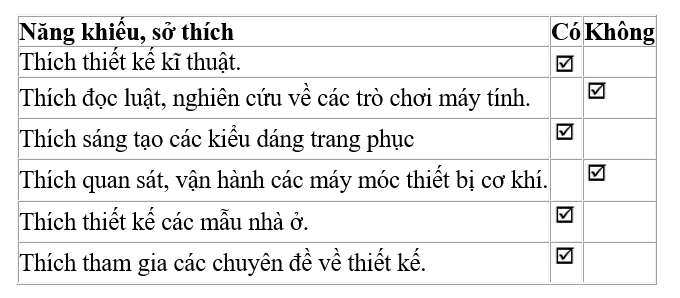 vào bảng dưới đây để xác định sở thích của bản thân với các nghề liên quan đến thiết kế.