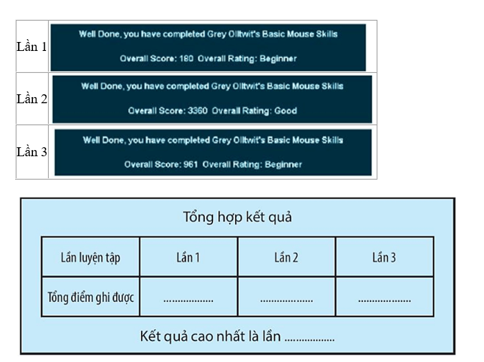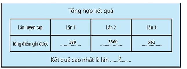 Quan sát màn hình tổng kết điểm sau 3 lần luyện tập của bạn Hương rồi điền vào chỗ trống để hoàn thành bản nhận xét kết quả luyện tập của bạn Hương.