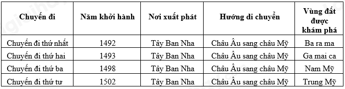 Các cuộc hải trình đến châu Mỹ của Cri-xtô-phơ Cô-lôm-bô xuất phát từ Tây Ban Nha => Chọn đáp án D.