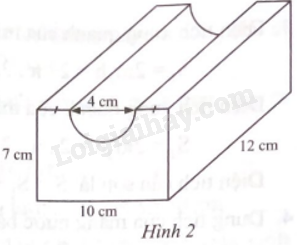 Một khối hộp chữ nhật đặc với kích thước ba cạnh là 12 cm, 10 cm, 7 cm bị khoét bởi một nửa hình trụ có đường kính 4 cm và chiều dài 12 cm (Hình 2). Tính