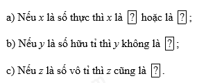 a) Nếu x là số thực thì x là số hữu tỉ hoặc là số vô tỉ;