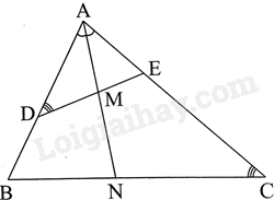 b) Tia phân giác của góc BAC cắt DE tại M và cắt BC tại N. Chứng minh rằng \(ME.NC = MD.NB\)