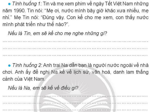 - Tình huống 1: Nếu em là Tin, em sẽ kể cho mẹ nghe về sự phát triển trong nhà nước như: ngày nay đường xá rộng lớn và đẹp hơn, xe cô hầu hết là xe máy và ô tô chứ không như Tết năm 1990 chỉ có xe đạp là chủ yếu, mâm cỗ ngày nay cũng nhiều món ăn hơn,…..