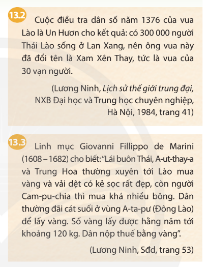 Dựa vào thông tin trong bài, đọc các tư liệu 13.2, 13.3 em hãy nêu những biểu hiện về sự phát triển của vương quốc Lào thời Lan Xang.