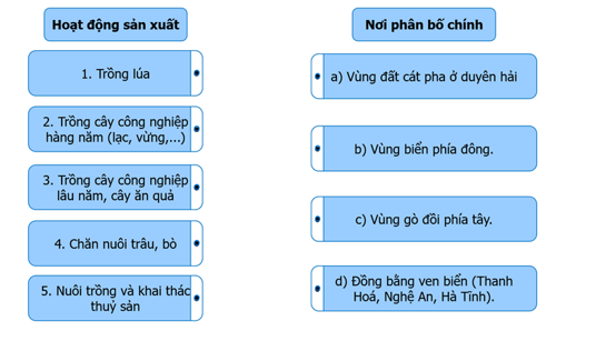 Ghép thông tin ở cột bên trái với thông tin ở cột bên phải cho phù hợp về tình hình phân bố sản xuất nông nghiệp ở Bắc Trung Bộ.