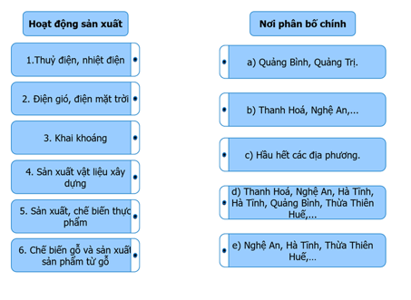Ghép thông tin ở cột bên trái với thông tin ở cột bên phải cho phù hợp về tình hình phân bố sản xuất công nghiệp ở Bắc Trung Bộ.