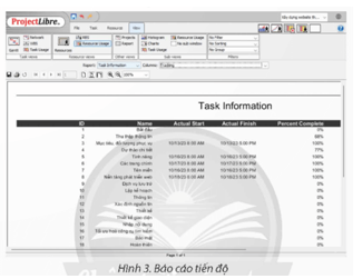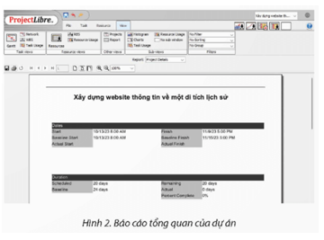 Trong quá trình thực hiện dự án Xây dựng website thông tin giới thiệu trường của em, việc sử dụng phần mềm quản lí dự án ProjectLibre đã giúp ích cho em trong công tác quản lí tiến độ thực hiện, kiểm soát tài nguyên, chi phí như sau:
