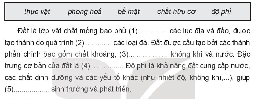 Đất được cấu tạo bởi các thành phần chính nào? Đặc điểm nào sau đây không đúng với vỏ phong hóa? Nhân tố khởi đầu cho quá trình hình thành đất là. Nhận định nào sau đây không đúng đối với quá trình hình thành đất? Tầng đất thường dày nhất ở khu vực nào dưới đây? Nhân tố nào hạn chế sự xói mòn của nước, điều hòa nhiệt độ ở lớp không khí gần mặt đất, điều hòa lại lượng nước thấm vào đất? Trong các câu sau, câu nào đúng, câu nào sai? Hãy sửa lại các câu sai. Hãy sử dụng các cụm từ sau để hoàn thà