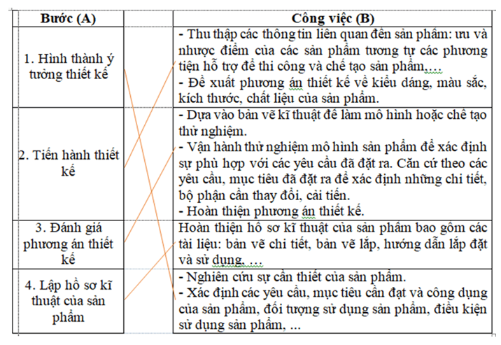 Hãy nối bước ở cột A với công việc của quy trình thiết kế kĩ thuật ở cột B cho phù hợp.