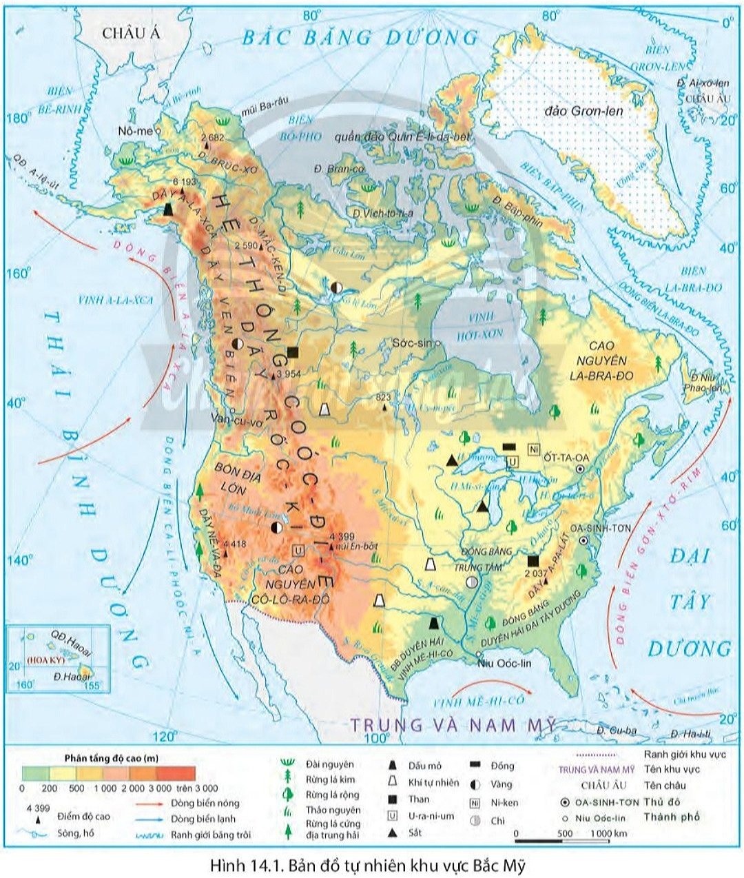 Quan sát hình 14.1 và đọc thông tin trong mục 1 (Đặc điểm chung của thiên nhiên Bắc Mĩ)..