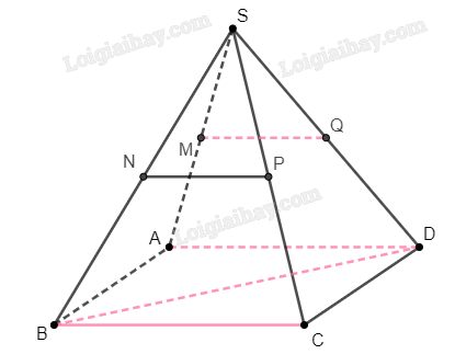 Ta có \(N\) là trung điểm của \(SB\), \(P\) là trung điểm của \(SC\), suy ra \(NP\) là đường trung bình của tam giác \(SBC\). Từ đó ta có \(NP\parallel BC\). Chứng minh tương tự ta cũng có \(MQ\parallel AD\).