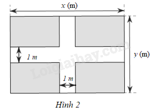 Một mảnh đất có dạng hình chữ nhật với chiều dài là \(x\)(m), chiều rộng là \(y\) (m) với \(1 < y < x\). Người ta để lối đi có độ rộng 1 (m) (phần không tô màu) như Hình 2.
