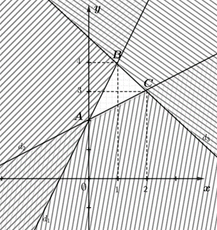 Ta có ba đường thẳng: \({d_1}: - 2x + y = 2;{d_2}: - x + 2y = 4\) và \({d_3}:x + y = 5\)
