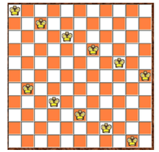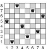 Trên bàn cờ vua chúng ta đều biết Hậu là quân cờ mạnh nhất vì nó có thể di chuyển theo tất cả các hướng ngang, dọc và chéo. Một bài toán vui rất nổi tiếng là tìm cách sắp xếp 8 quân Hậu trên bàn cờ sao cho không quân Hậu nào khống chế con nào. Em hãy thử tìm một cách xếp quân Hậu khác với cách xếp như hình sau: