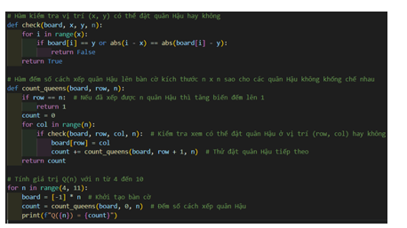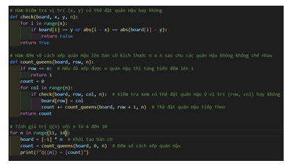 Gọi Q(n) là số các cách xếp n quân Hậu lên bàn cờ kích thước n x n sao cho các quân Hậu không khống chế nhau. Sử dụng thuật toán đã được học, em hãy viết chương trình tính các giá trị Q(n) với n = 4, 5, 6, 7, 8, 9, 10