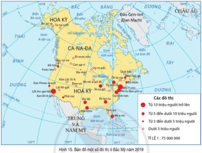 - Các đô thị từ 5 triệu dân trở lên ở Bắc Mỹ: Mi-a-mi, Đa-lát, Hiu-xtơn, Át-lan-ta, Oa-sinh-tơn, Phi-la-den-phi-a, Niu Y-oóc, Lốt An-giơ-lét, Si-ca-gô, Tô-rôn-tô.