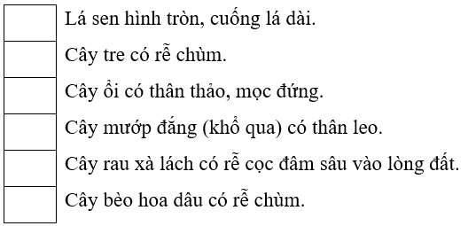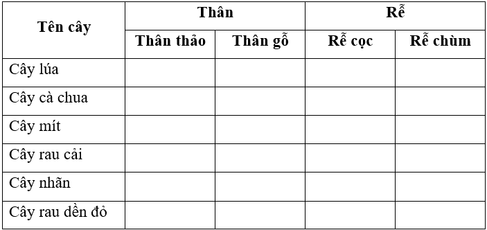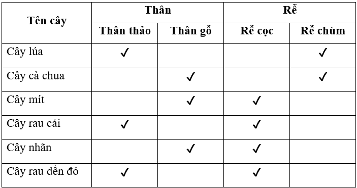 Đánh dấu ✔ vào cột sao cho phù hợp với loại thân và rễ của các cây sau.