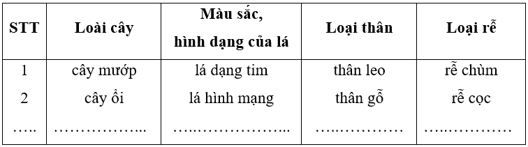 Quan sát vườn nhà em hoặc vườn trường và viết vào chỗ (…) trong bảng dưới đây tên một số loài cây cùng đặc điểm lá, thân, rễ.