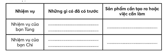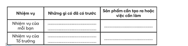 Em hãy điền vào chỗ chấm trong bảng dưới đây để mô tả nhiệm vụ của mỗi bạn trong tổ và nhiệm vụ của tổ trưởng.