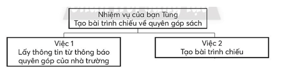 - Tùng: Tớ sẽ xem thông báo của nhà trường và làm bài trình chiếu về loại, sách vở cần quyên góp và thời hạn quyên góp.