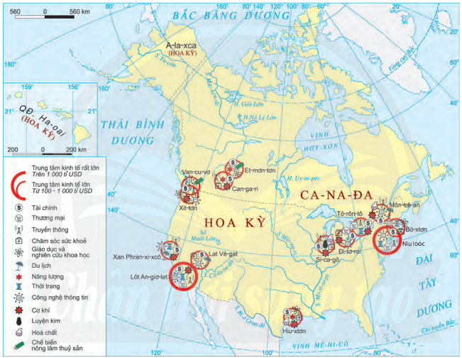 - Xác định trên bản đồ các trung tâm kinh tế quan trọng của Bắc Mỹ.