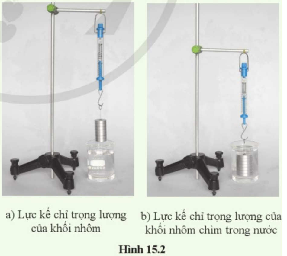 - Tiến hành thí nghiệm như hình 15.2, nêu hướng của lực do nước tác dụng lên khối nhôm.