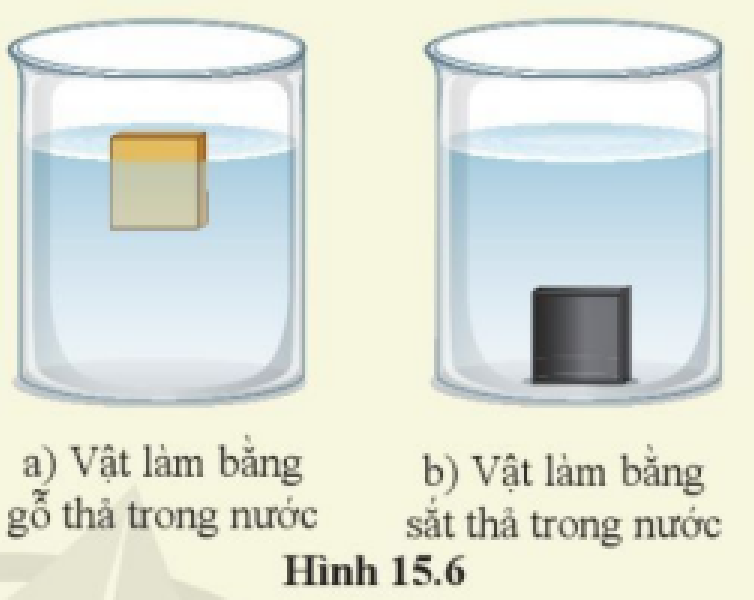 Thả vào trong nước hai vật hình hộp có kích thước giống nhau, một vật bằng gỗ và một vật bằng sắt vào trong nước (Hình 15.6). So sánh lực đẩy Acsimet tác dụng lên hai vật.