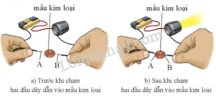 Sau khi chạm hai đầu dây dẫn A và B vào mẩu kim loại thì bóng đèn sáng