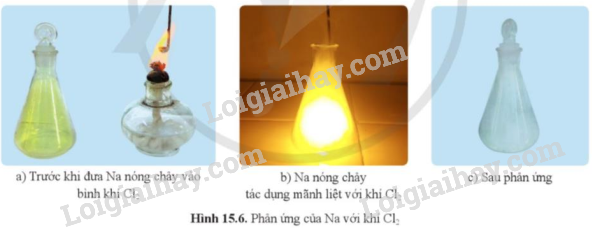 Quan sát hình 15.6 và cho biết khả năng phản ứng của natri với khí chlorine (b) như thế nào