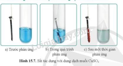 Quan sát hình 15.7 cho biết trước, trong và sau một thời gian phản ứng, màu của dung dịch CuSO4 và đinh sắt thay đổi như thế nào? Giải thích