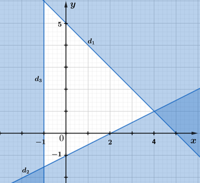 b) Ta có b đường thẳng: \({d_1}:x + y = 5;{d_2}:x - 2y = 2;{d_3}:x = - 1\)