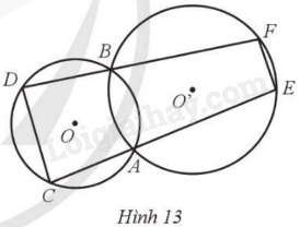 Ở Hình 13, hai đường tròn (O), (O’) giao nhau tại A, B và CD là một dây cung của (O). Tia CA cắt (O’) tại E và tia DB cắt (O’) tại F. Chứng minh EF song song với CD.