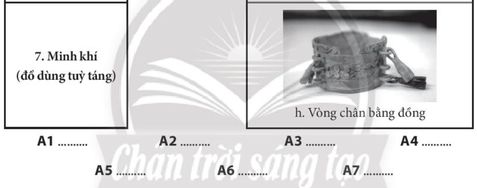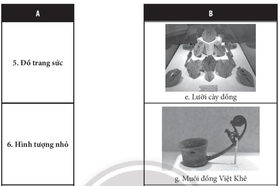Câu 2. Hãy chọn hình ảnh các di vật đồ đồng Đông Sơn ở cột B với nhóm loại ở cột A và điền vào chỗ trống (…) dưới bảng. Quan sát các di vật và tìm ra đặc trưng của đồ đồng Đông Sơn. Kĩ thuật đúc đồng của cư dân Đông Sơn có điểm độc đáo nào?