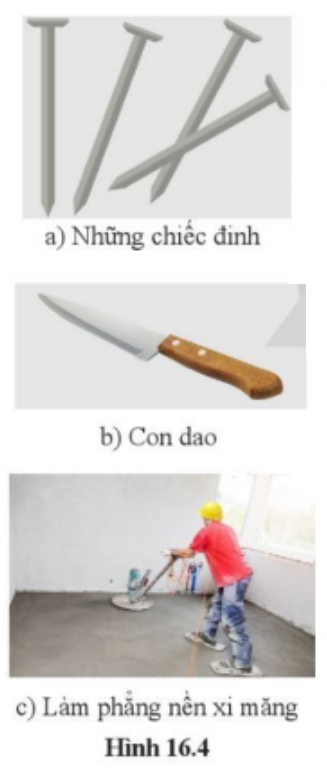 a, Các mũi đinh đều được vuốt nhọn (hình 16.4a) vì để giảm diện tích tiếp xúc, khiến khi đóng đinh áp suất sẽ cao và đinh sẽ được đóng dễ hơn.