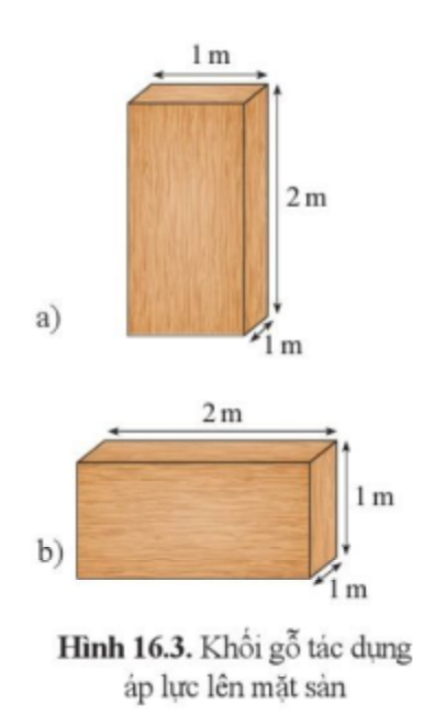 Một khối gỗ hình hộp chữ nhật có kích thước 1 m x 1 m x 2 m và có trọng lượng 200N. Tính áp suất khối gỗ tác dụng lên mặt sàn trong hai trường hợp ở hình 16.3.