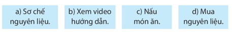 Bạn An và mẹ đang muốn làm một món ăn mới. Công việc này được chia thành những việc nhỏ. Hãy sắp xếp các việc sau đây theo thứ tự đúng.