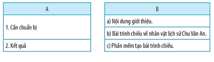 Các bạn An, Minh, Khoa muốn tạo một bài trình chiếu để trình bày trước cô giáo và các bạn về nhân vật lịch sử Chu Văn An. Hãy nối mỗi mục ở cột A với mỗi mục thích hợp ở cột B.
